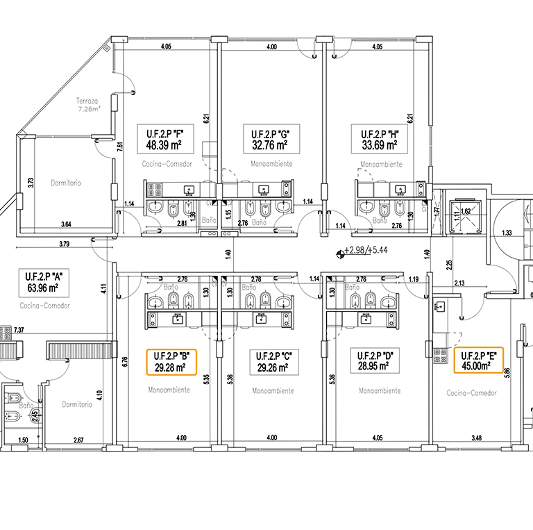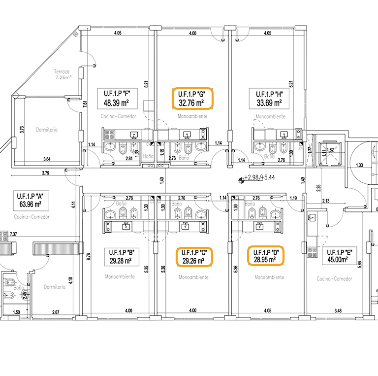 Departamentos a estrenar de un ambiente y baño completo. Las unidades poseen 28,95 m2, 29,26 m2 y 32,76 m2.